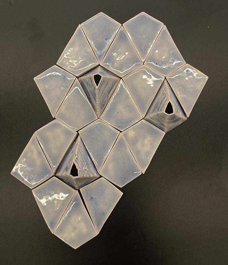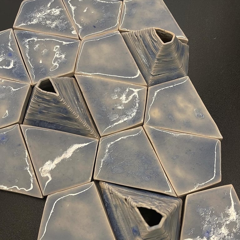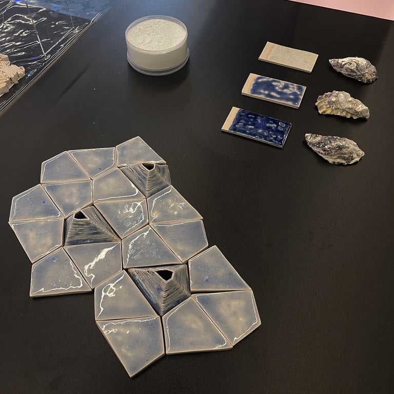 I collected discarded oyster shells from a restaurant and transformed them into glaze. The glaze was then coated onto digitally traced, 3D- printed oyster shells and tiles.