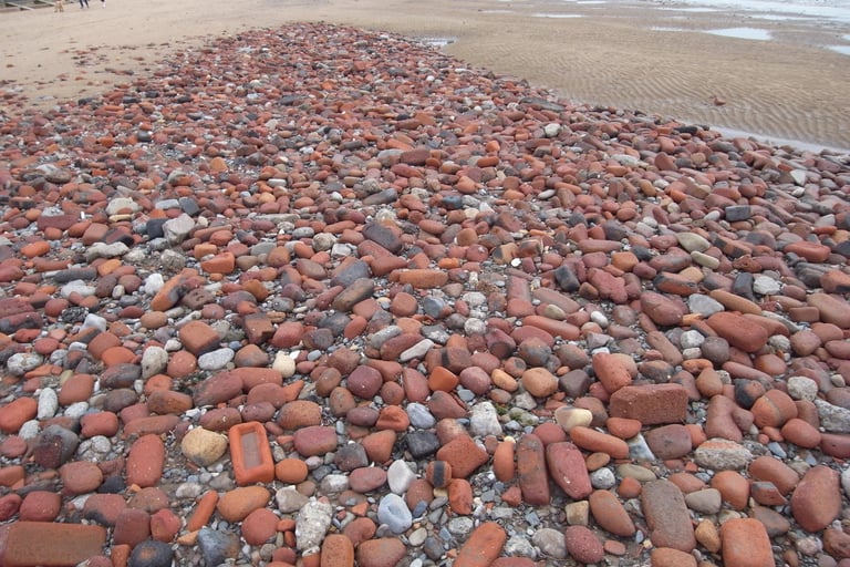 Countless pieces of rubble—bricks, mortar, and tiles—can be found all over Liverpool's Crosby Beach. They were left behind after the World War II Blitz. Year after year, the tide erodes the bricks, softening their edges. Many of them now look like pebbles—very round and smooth. From this, I can imagine how long these bricks have been on the beach. Imagining the houses and buildings that were destroyed, and the bricks left behind after the conflict, I think they could once have been part of someone’s home. It feels as though I can see traces of people’s pasts and memories in these remnants.